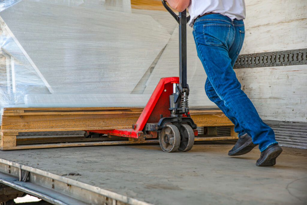 rozładowuje palety z samochodu,